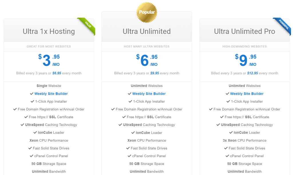 Ultra Web Hosting offers three shared hosting plans (some of which are optimized for the Weebly website builder and NGINX). With these shared hosting plans, you’ll get: